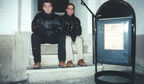 Fernando (scared of sth!) and Saulo seating on the stairs inside the Castle |
